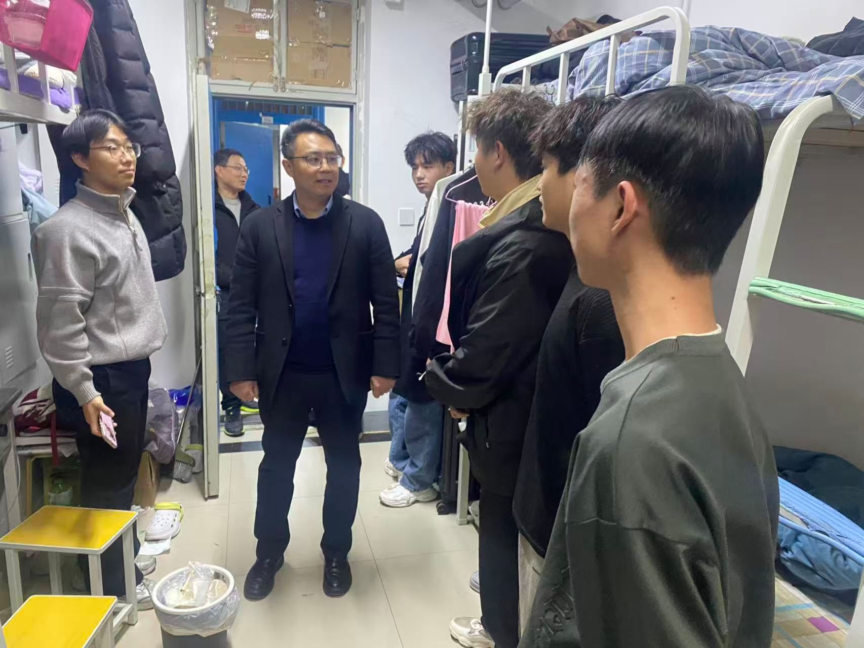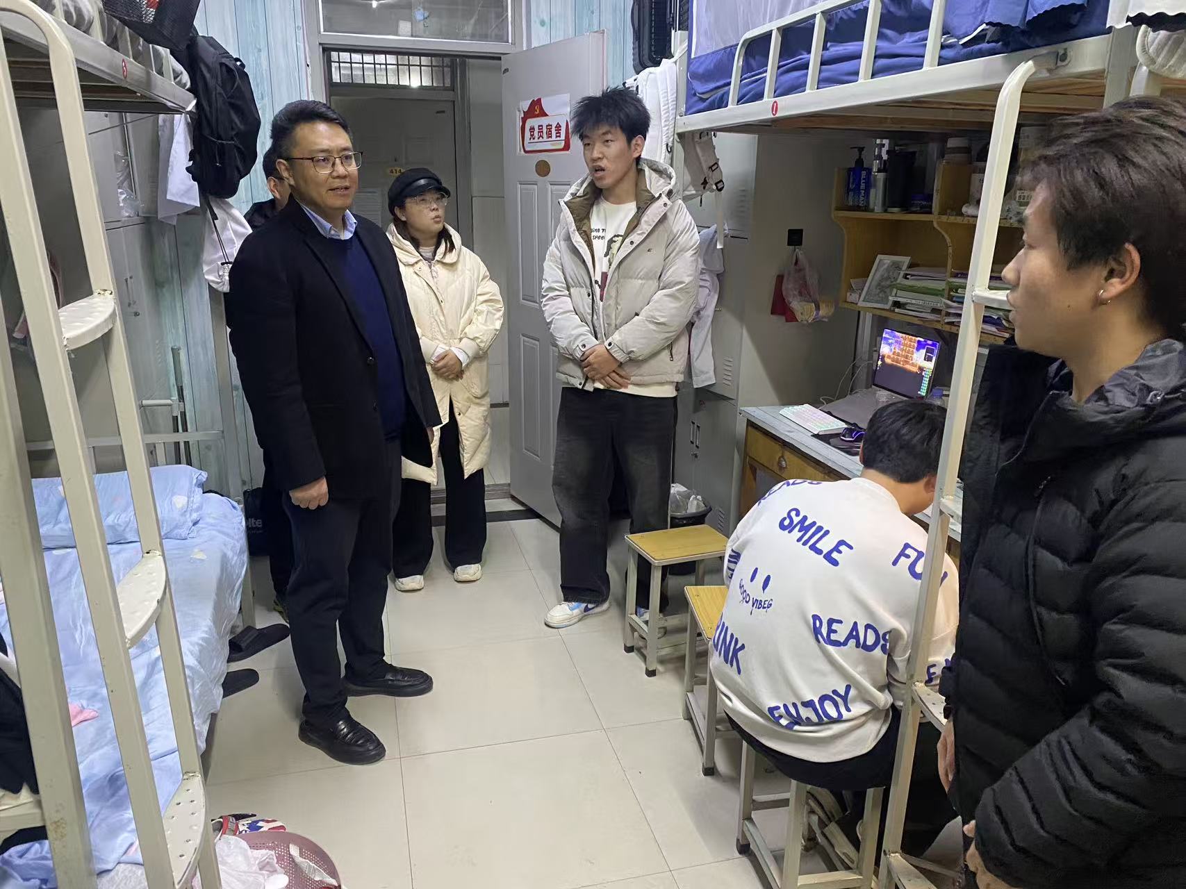 在走访过程中,王鑫磊书记与同学们面对面交流、心贴心沟通。每到一间宿舍,他都首先向同学们问好,仔细查看宿舍的居住环境,认真询问大家的住宿感受、饮食情况以及学习上遇到的难题,从宿舍供暖温度到水电使用安全,从专业课程学习到未来发展规划,事无巨细,关怀备至。
