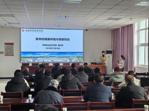 12月26日,应舞钢市畜牧业发展中心邀请,动物科技学院副院长秦改晓受邀参加舞钢市2025年水产优良品种引进繁育和示范推广培训活动,以“鱼类健康养殖与病害防控”为主题做专题报告,为当地水产从业者送上精准实用的技术大餐。